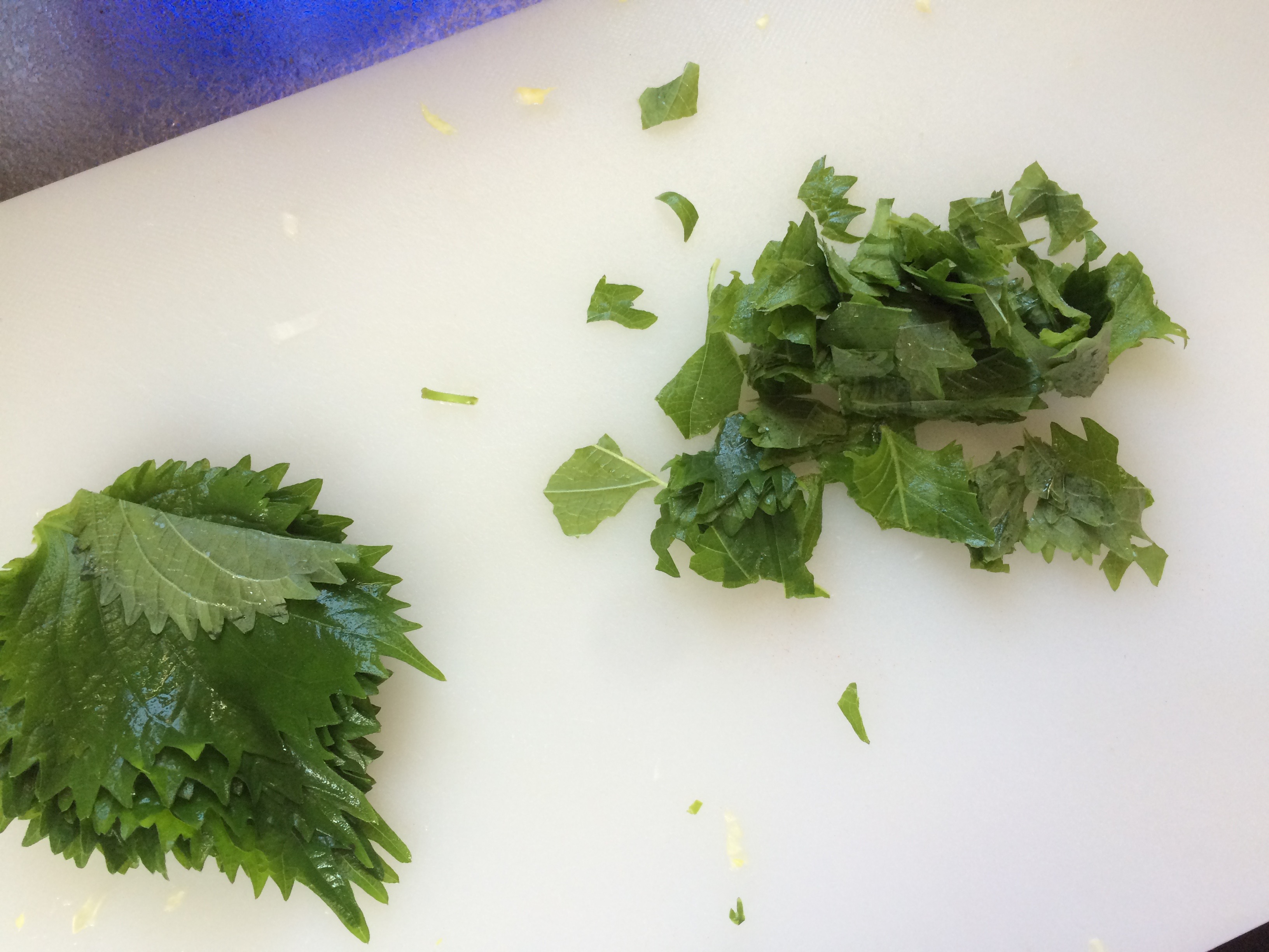 しそを切ります。こちらも細かくしすぎると風味が飛ぶのでざっくり切ってください。